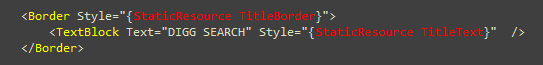 Chú ý rằng chúng ta đã đặt cho mỗi Style một giá trị duy nhất cho “Key”. Chúng ta có thể cập nhật lại <Border> và <TextBlock> để tham chiếu đến các Style bằng cách dùng các Key. Chúng ta sẽ dùng một đặt tính trong XAML được gọi là “markup extensions” để làm điều này. “Markup extensions” được dùng khi có các giá trị không là literal (literal là các giá trị được đưa vào cụ thể như 1, 100, “abc” – khác với các giá trị chỉ biết được khi chạy chương trình như các giá trị được lưu trong các biến, kết quả trả về của hàm, hoặc dùng các biểu thức gắn nối dữ liệu…)
