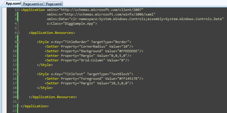 Đối với ứng dụng mẫu Digg, chúng ta sẽ định nghĩa các khai báo Style bên trong file App.xaml. Điều này cho phép chúng ta có thể dùng lại trong suốt toàn bộ các trang và control trong toàn ứng dụng.