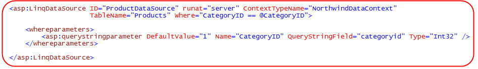 Ví dụ, cho là bạn đã tạo ra một mô hình dữ liệu LINQ to SQL của CSDL Northwind (cách dùng đã được nói đến trong phần 2 cuẩ loạt bài này), chúng ta có có thể khai báo một control <asp:LinqDataSource> trên trang với một mệnh để <where> mà nó chỉ trả về các sản phẩm thuộc một chủng loại nào đó (được chỉ ra qua tham số “categoryid” của chuỗi query string):