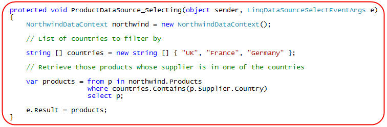 For example, below is a LINQ to SQL query expression that retrieves only products from suppliers based in a specific set of countries: